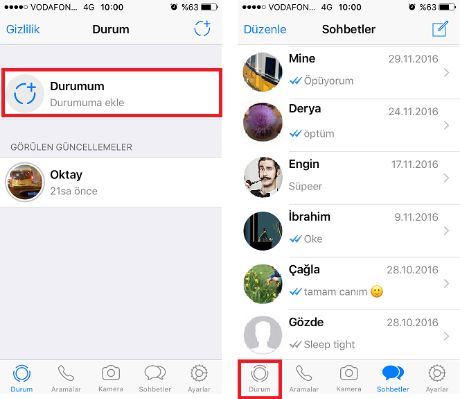 Fotoğrafların üzerine farklı renklerde serbest çizim yapmanıza ve metin yazmanıza da olanak veren Durum (Status), WhatsApp’ın Snapchat’e cevabı olarak görülüyor.