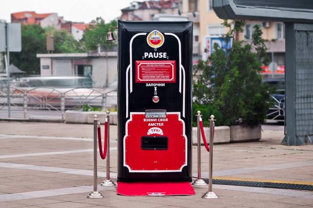 Bira markası Amstel insanları ilginç bir yöntemle ödüllendirmiş. Bulgaristan’da sokağa yerleştir ototmatların karşısında üç dakika boyunca hiçbir şey yapmadan duran insanlara ödül olarak bira vermiş. Bira markasının Pause isimli projesinin bir parçası olan bu eğlenceli fikri NEXT-DC yaratmış. Amaç biraz ara vermek, biraz rahatlamak.