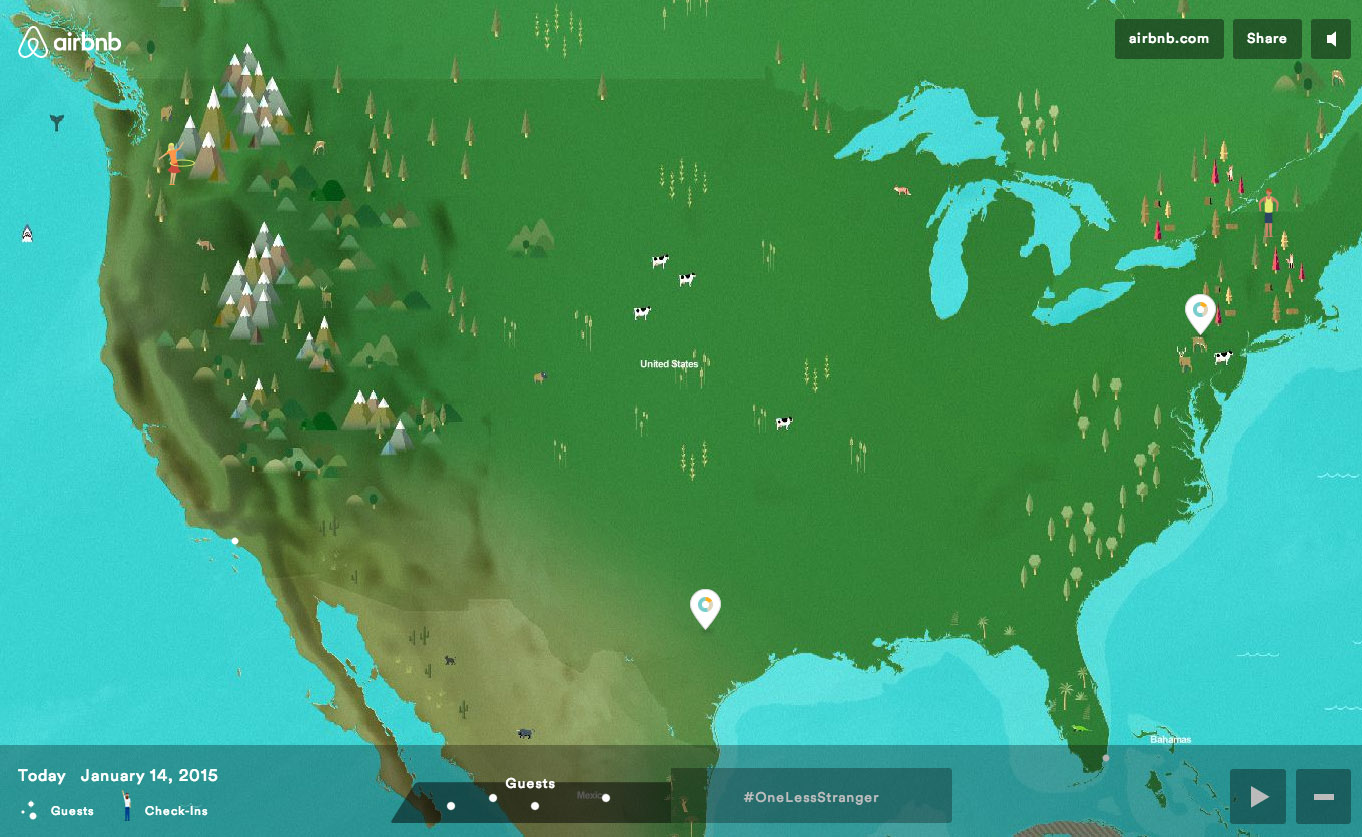 Harita, gerçek zamanlı check-in’lerin yanı sıra, dünyanın en çok tercih edilen noktaları, tercih edilme sebepleri ve istatistikler hakkında bilgi içeriyor. Örneğin 2014 yeni yıl gecesinin 550.000’e yakın gezgin sayesinde Airbnb’nin gelmiş geçmiş en büyük gecesi olması gibi…