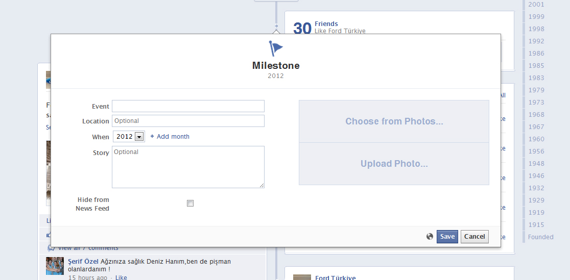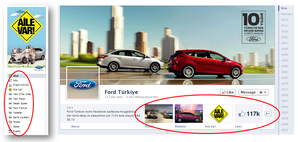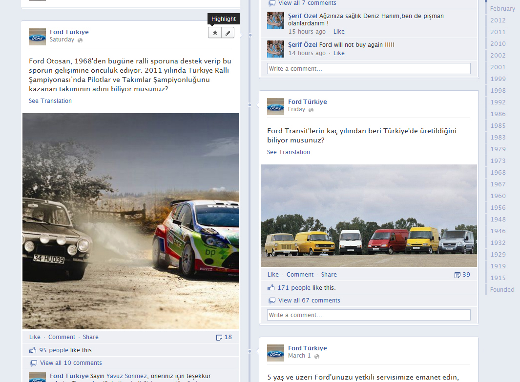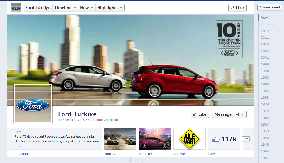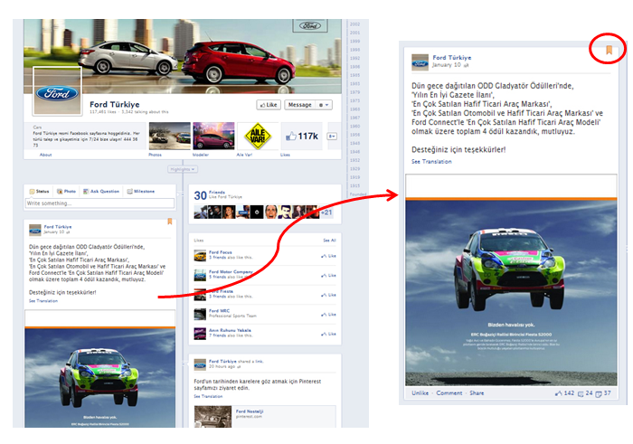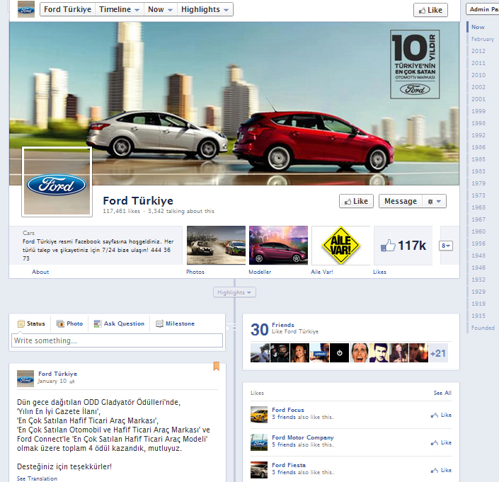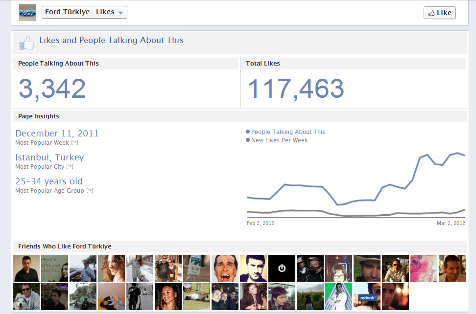 One of the important features of the new design is the detailed ‘page like insights’ that can be viewed by anyone who visits the page and they don’t even have to be fans to see it. When we take a look at the Ford Turkey brand page, not only we are able to see the total number of people who like to page and number of people who are talking about this page but also see the most popular week, the most popular city and the most popular age group. And we can also view a one month graph that shows daily new likes and talked about numbers.
