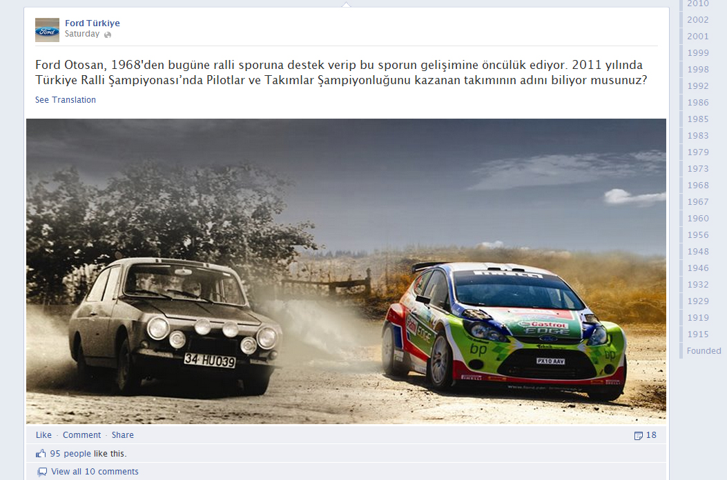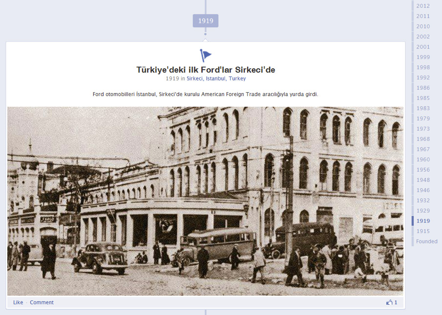 Not surprisingly, Ford Turkey brand page does a great job utilizing Milestones for their Facebook Timeline. They’ve not only entered events and major achievements that occurred in the US but included milestones that took place in Turkey that go back to 1919 all which include a story and an engaging image.