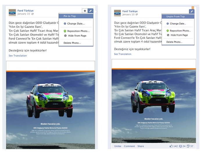 Pinning items to the top of the Timeline will become an important feature to highlight new and interesting content. This is especially useful for brands that post frequently and don’t want important campaign or promotional information to get buried in their Timeline. If a promotional campaign that has been posted 10 days ago, is still valid, they no longer have to post the same information over and over again. All they have to do is to pin the original post.