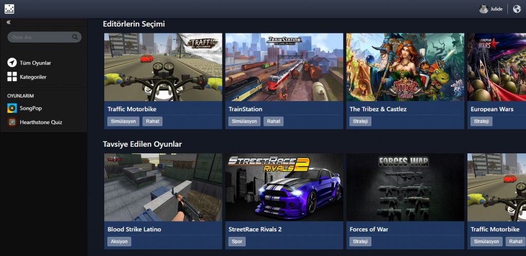 Ardından karşınıza çıkan ekranda farklı oyun kategorilerinde gezebiliyor, isterseniz tüm oyunları tek bir listede inceleyebiliyor ve eğer dilerseniz önceden oynamış olduğunuz oyunları görebiliyorsunuz.