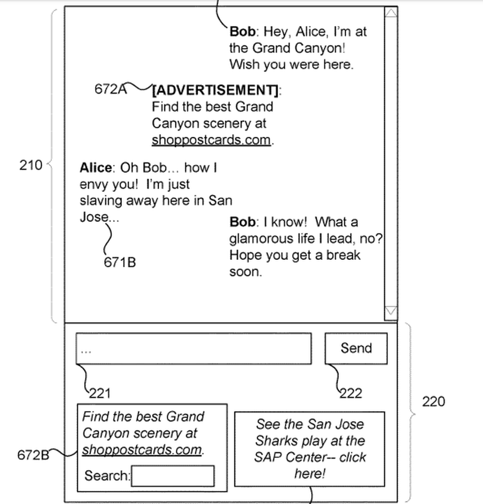 2015 yılında yapılan bir patent başvurusunun kamuoyuna açıklanmasıyla ortaya çıkan girişim; işletmelerin konum verilerini ve konuşmaların içeriğini kullanarak oluşturacağı hedeflenmiş reklamları doğrudan bir “eklenti yoluyla” kullanıcıların sohbetlerinde göstermek için kullanabileceklerini açıklıyor.