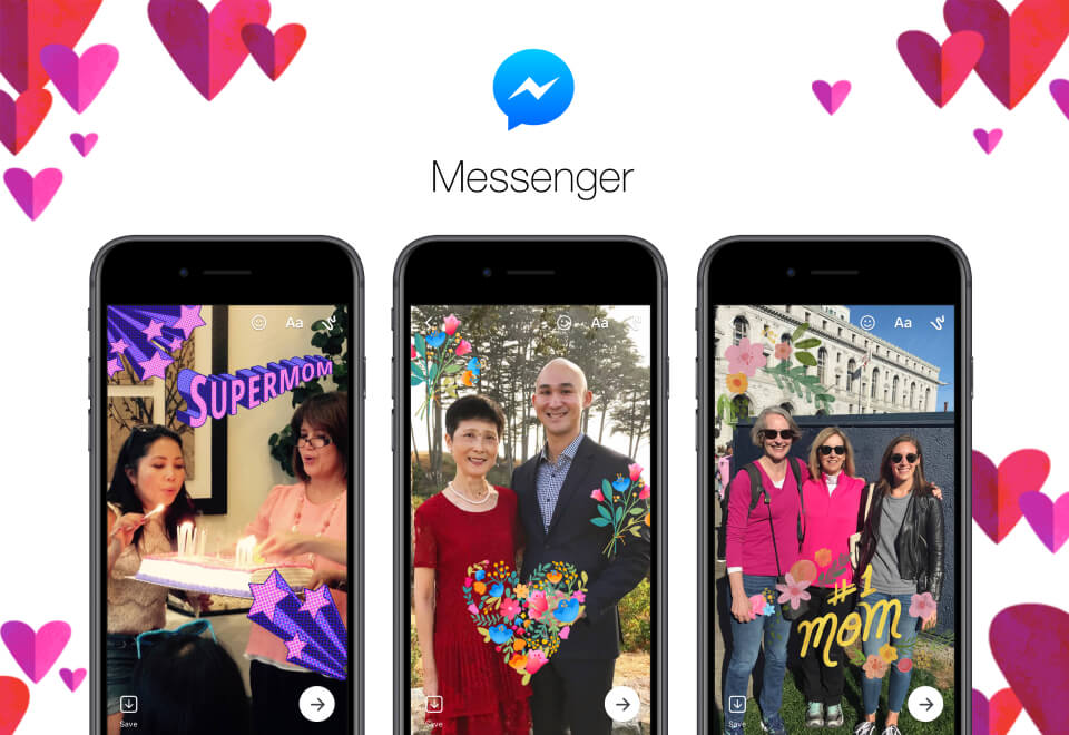 Anneler Günü için Messenger uygulamasını da unutmayan Facebook, bu mecraya özel tasarımlar hazırladı. Messenger kamerasını açtığınızda annenizi ne kadar çok sevdiğinizi anlatabileceğiniz eğlenceli etiketler ve çerçeveler bulabileceksiniz. Çiçeklerden oluşmuş hoş bir kalp etiketi veya bir buket, annenizle çekileceğiniz bir fotoğrafı daha sevimli hale getirecek.