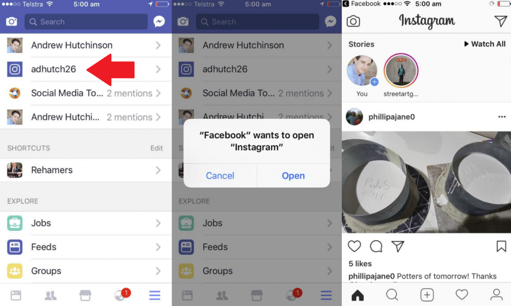Bazı kullanıcılar Facebook uygulamasındayken kişisel Instagram hesaplarına da kolaylıkla geçiş yapabildiklerini gördüler. Instagram hesaplarına tıkladıklarında “Facebook Instagram’ı açmak istiyor.” uyarısı geldi. Kabul ettiklerinde Instagram uygulamasına hızlıca geçiş yaptılar.