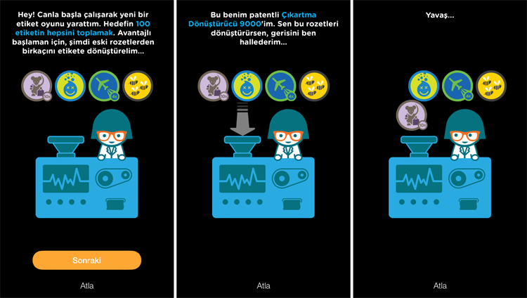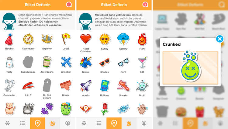 Rozetlerin etiketleri çevirme işlemi sonrası “Etiket Defteriniz”de 100 tane etiket alanı olacak. Ekranı aşağıya doğru kaydırdığınızda bunlara ek bazı ekstra etiketler de göreceksiniz. Henüz kazanılmayan etiketler için farklı mekanlarda check-in yaparak etiket defterinizi doldurabilirsiniz. Etiketlerin üstüne dokunarak hakkında bilgi alabilirsiniz. Yeni sürüm ile etiketlerin sadece sayısı değil, ebatları ve görüntüleri de tamamen güncellenmiş durumda.