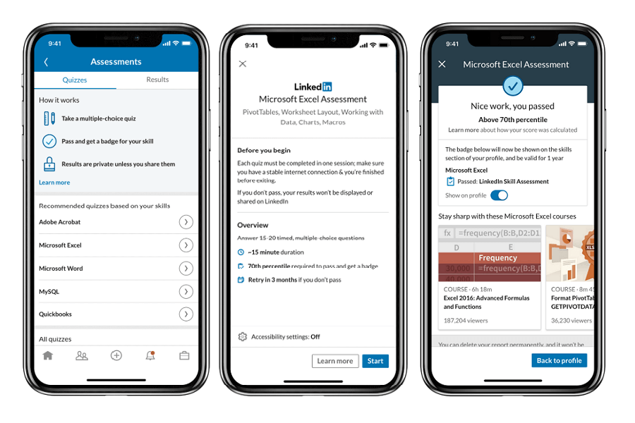 LinkedIn yetenek testleri, önceden hazırlanmış kısa standart testler ile profilinizde yer alan yeteneklerinizi objektif ve güvenilir şekilde onaylatmanızı sağlıyor. Onaylatabileceğiniz yetenekler arasında Adobe Photoshop, Java, MySQL, Microsoft Excel gibi programlar var. Bu testleri aldığınızda eğer en az %70 başarı gösterirseniz, profilinizde onaylanmış yetenek ibaresi görülüyor. Sonuçlar, siz istediğiniz takdirde gizli kalabiliyor hatta tamamen silinebiliyor. Başarısız olduğunuzda testi tekrar almanız da mümkün.