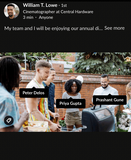Kurumsal bir LinkedIn sayfasının üretim hattından paylaştığı bir fotoğrafta alın teriyle çalışan Ahmet Usta’yı etiketlemesi daha samimi olmaz mı? Ya da çalışanlarıyla birlikte imza attıkları bir başarıyı kutlayan yöneticinin, paylaştığı toplu fotoğrafta emeği geçen herkesi etiketlemesi güzel olmaz mı? İşte LinkedIn’in dev yeniliklerinden biri bu: Diğer sosyal medya platformlarında olduğu gibi LinkedIn’de de paylaştığımız fotoğraflardaki kişileri etiketleyebileceğiz.