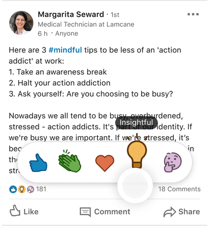 Diğer yeniliğin duyurusunu aslında Nisan 2019’da yapmıştık: reaksiyonlar! LinkedIn’e yepyeni reaksiyonlarımız Kutlama (Celebrate), Sevgi (Love), Bilgili (Insightful) ve Meraklı (Curious) geliyor. Böylece terfi eden arkadaşlarınızı alkışlarla tebrik edebilir, sizinle birlikte yaşadığı bir deneyimi paylaşan iş arkadaşınıza kucak dolusu sevgiler yollayabilir ya da yeni öğrendiğiniz bir şeyi ifade etmek için bilgili emoji’sini kullanabilirsiniz.