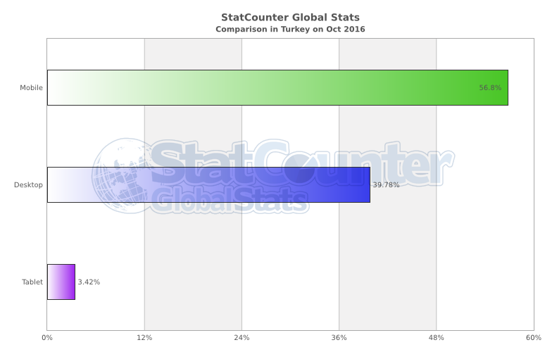 Globalde ve ülke bazında internet kullanım istatistiklerini kaydeden StatCounter web sitesi, Ekim 2016 itibarıyla dünya tarihinde ilk kez mobilde ve tabletteki internet kullanımının masaüstünü geçtiğini duyurdu.