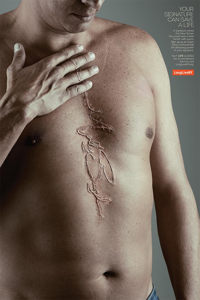 New York, organ bağışına destek verip, kayıt yaptırmış Amerika şehirleri arasında sonuncu sırada yer alıyor. Daha da fazlası ne yazık ki New York, hayatlarını kurtaracak organı bekleyen kişilerin bulunduğu iller sıralamasında ise üçüncü sırada yer alıyor. Bu korkutucu tabloyu değiştirmek isteyen kurum, organ bağışı için başlattığı imza kampanyasını vurucu afişler ile insanlara duyurmuş.