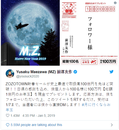 Japonya’nın en büyük çevrim içi mağazası Zozotown’ın sahibi olan Yusaku Maezawa, 5 Ocak’ta attığı Tweet ile Retweet rekorunu ele geçirdi. Şunu bilmelisiniz ki bu rekorun arkasında birazcık rüşvet var. ? Çünkü Yusaku Maezawa, kendisini takip eden ve Tweet’ini Retweet edenlerin arasından seçilecek 100 kişiye 100 milyon yen, yani yaklaşık 5 milyon TL, paylaştıracağını söyledi.