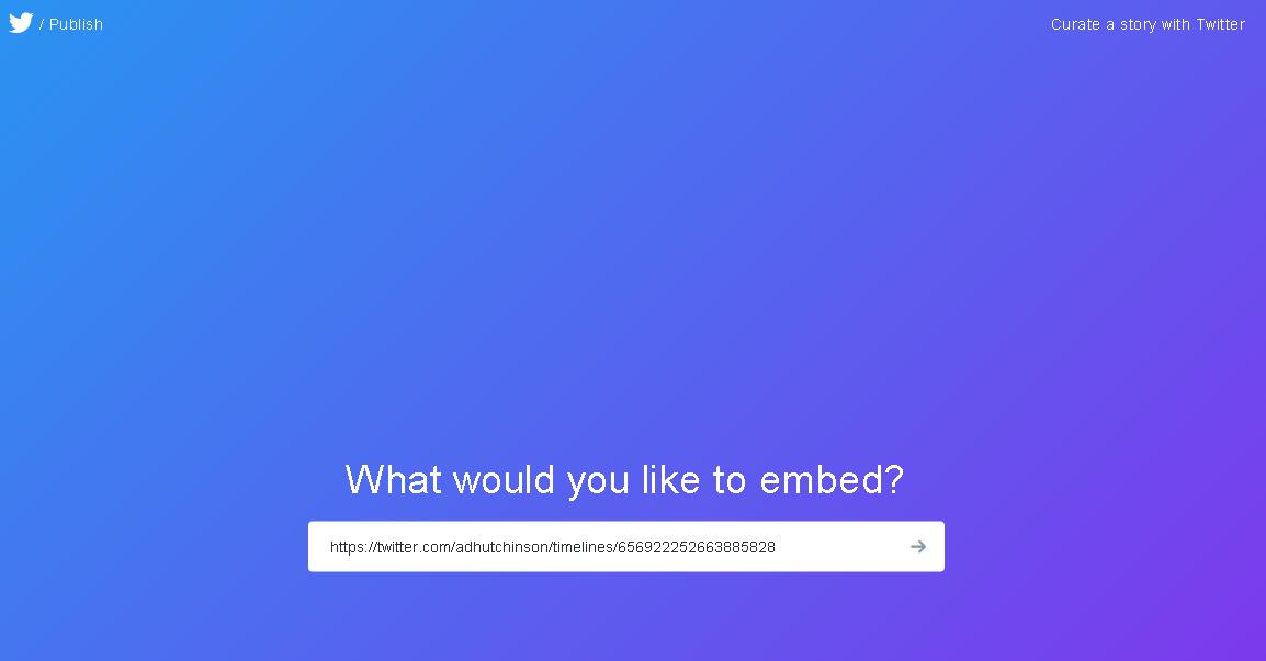 Tweet’lerinizden tek bir kare oluşturmak için TweetDeck, Curator, Spredfast, Dataminr, ScribbleLive, Wayin veya Flowics’i kullanabilirsiniz. Bu sayfalardan biri aracılığıyla hikayenizi oluşturduktan sonra web sitenize gömmek için gerekli olan Collection API sayesinde, bir araya getirdiğiniz koleksiyonun URL’sini “Publish” platformundan elde edebilirsiniz. Hikayeleştirilmiş Tweet örnekleri için Twitter Developers sayfasındaki özel linki inceleyebilirsiniz.
