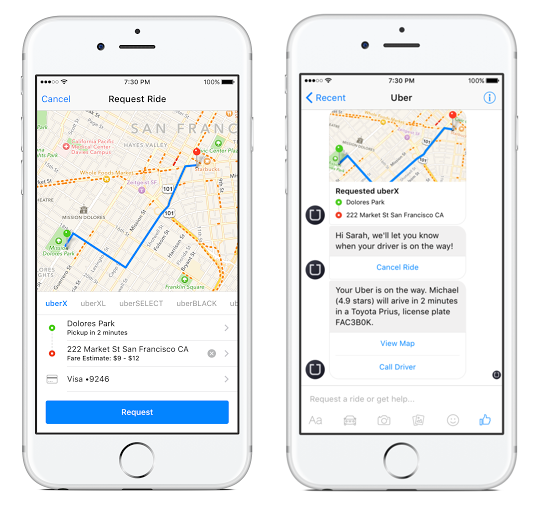 Artık bir telefonla değil, bir tıkla araç çağırma dönemi Messenger ile mümkün! Uber’in denediği özellikle sınırlı sayıda kullanıcı, Facebook Messenger uygulaması üzerinden araç çağırmaya başladı. Bu kullanıcıların tek yapması gereken; “request a ride (araç talep et)” butonunu tıklayarak Messenger üzerinden Uber robotu ile iletişime geçmek ve nereye gitmek istediklerini, aracın onları hangi adresten almaları gerektiğini chat ortamında belirtmek.